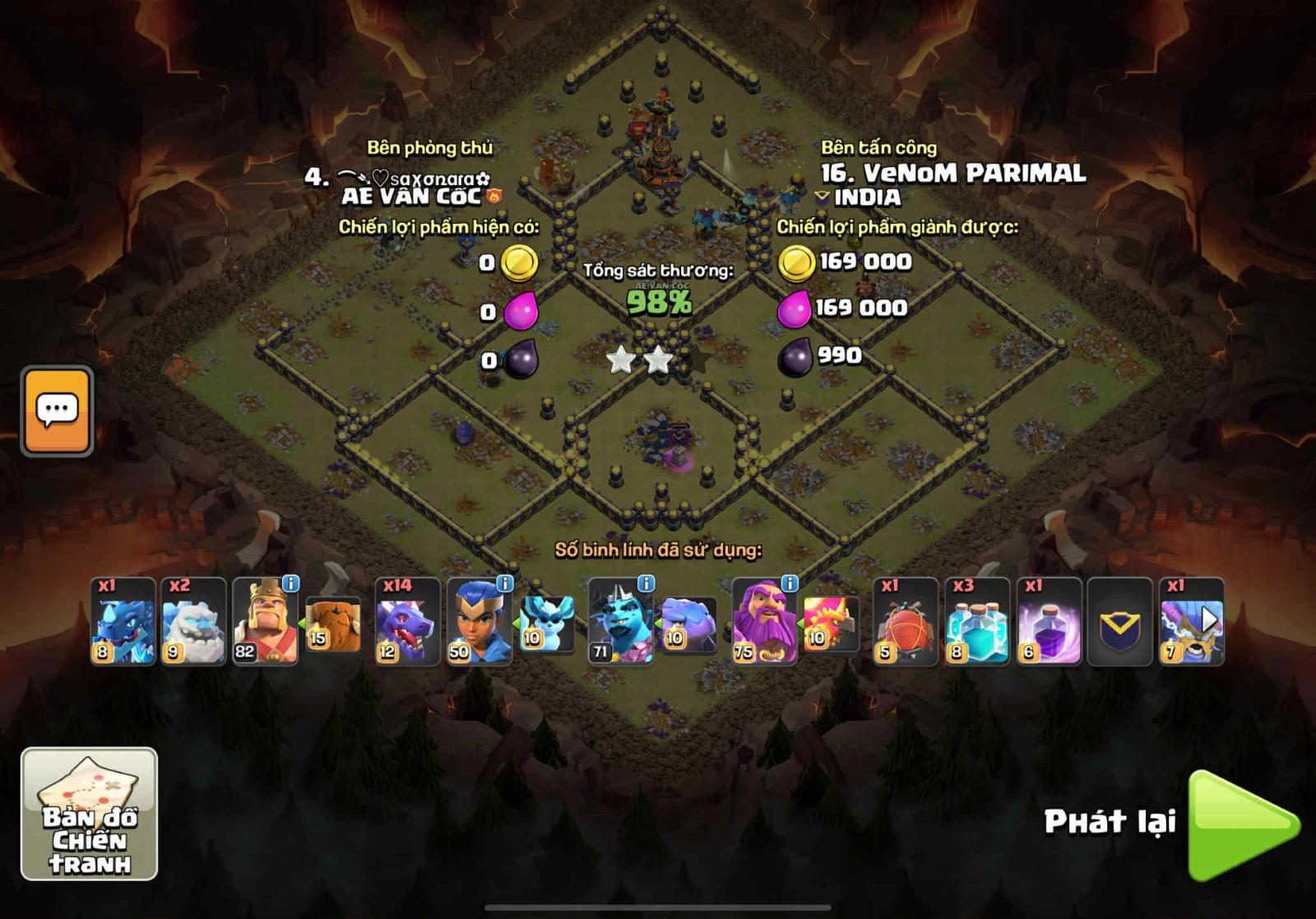Lính thủ nhà mình sử dụng head hunter, super minion , witch , ice golem khiến cho đối thủ gặp khá nhiều rắc rối. 2 xbow hướng khu vực nhà chính mình để là phòng không và mặt đất, 2 cái còn lại mình để mặt đất.