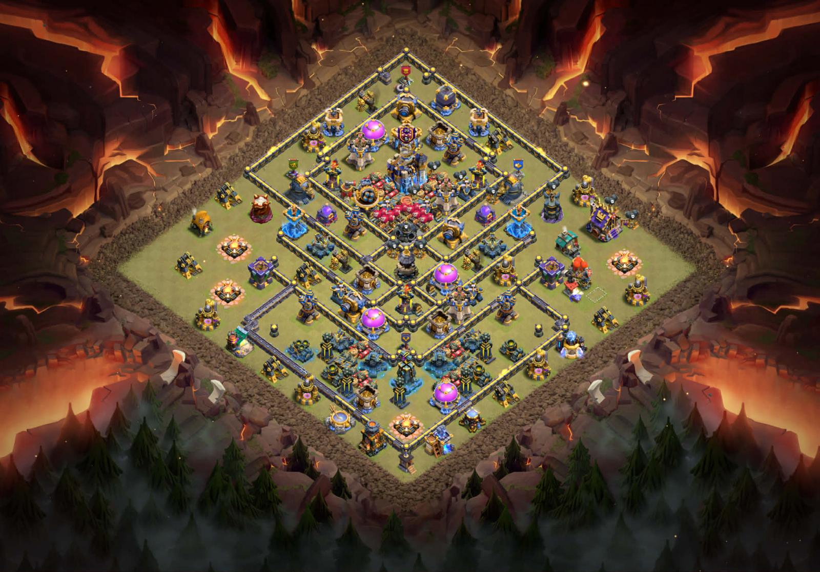 Nó có đầy đủ các công trình phòng thủ mới xưởng chế tạo, bom, mìn bay, nhà linh thú pets house, pháo đài đá và tháp thần chú, 2 tháp siêu pháp sư và tháp phục thù. Nó chống 3 sao rất tốt, các bạn có thể chỉnh inferno tháp hỏa ngục nhiều tia để tối ưu hóa khả năng phòng thủ nhé. Việc bố trí những bom bay ở vị trí xung quanh inferno nhiều tia khiến cho việc đi super queen và combo lính bay gặp rất nhiều khó khăn. khu vực trung tâm mẫu base tập trung rất nhiều bom bẫy, công trình phòng thủ máy bắn đá ở đấy hỗ trợ rất tốt.
