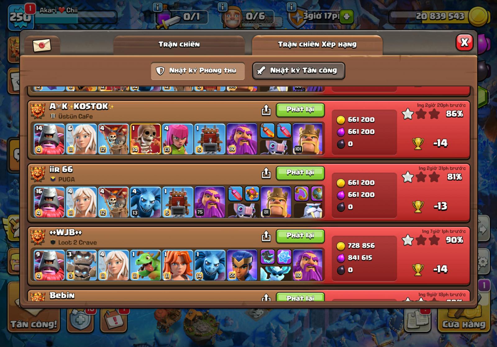 Lính thủ nhà mình sử dụng head hunter, super minion , witch , ice golem khiến cho đối thủ gặp khá nhiều rắc rối. 2 xbow hướng khu vực nhà chính mình để là phòng không và mặt đất, 2 cái còn lại mình để mặt đất.