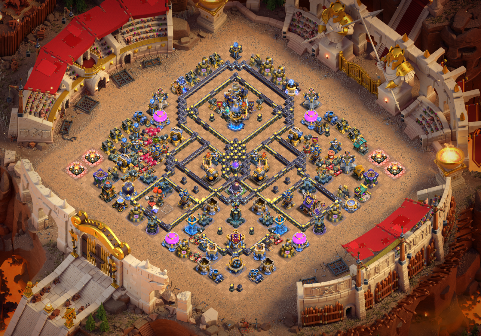 Nó có đầy đủ các công trình phòng thủ mới xưởng chế tạo, bom, mìn bay, nhà linh thú pets house, pháo đài đá và tháp thần chú, 2 tháp siêu pháp sư và tháp phục thù. Nó chống 3 sao rất tốt, các bạn có thể chỉnh inferno tháp hỏa ngục nhiều tia để tối ưu hóa khả năng phòng thủ nhé. Việc bố trí những bom bay ở vị trí xung quanh inferno nhiều tia khiến cho việc đi super queen và combo lính bay gặp rất nhiều khó khăn. khu vực trung tâm mẫu base tập trung rất nhiều bom bẫy, công trình phòng thủ máy bắn đá ở đấy hỗ trợ rất tốt.