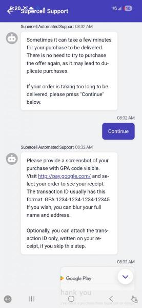 - Gửi ảnh biên lai và chờ phản hồi từ Supercell