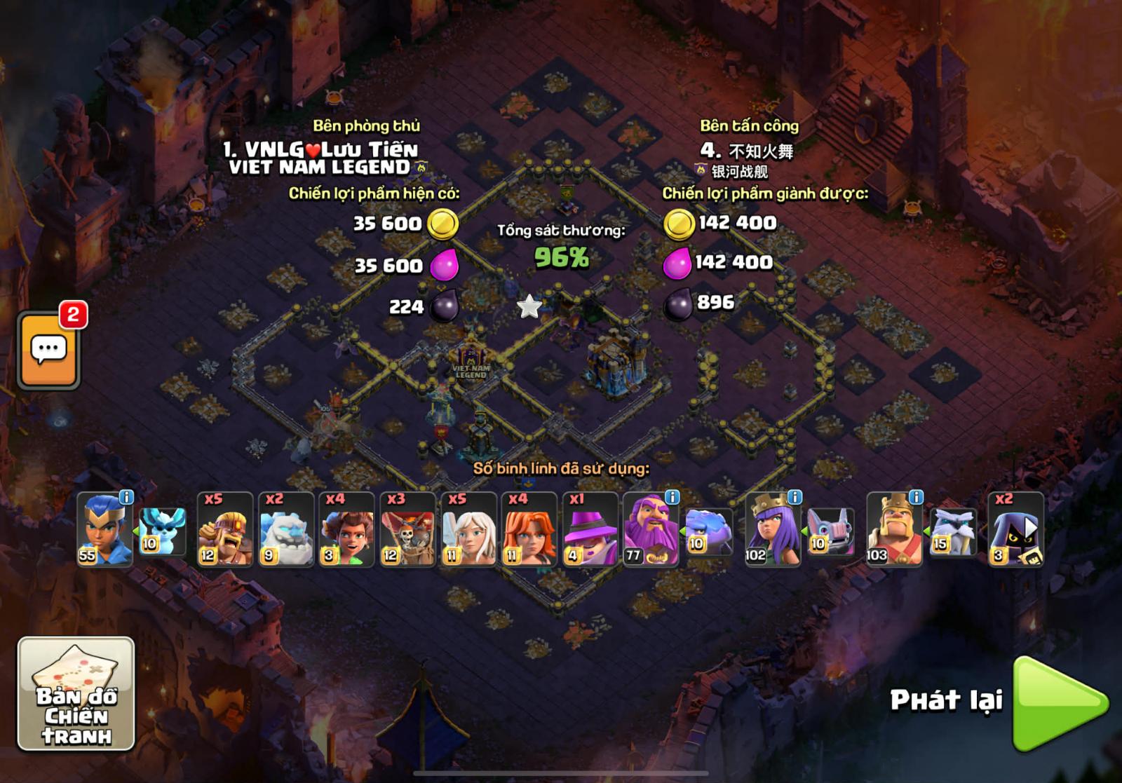 Lính thủ nhà mình sử dụng head hunter, super minion , witch , ice golem khiến cho đối thủ gặp khá nhiều rắc rối. 2 xbow hướng khu vực nhà chính mình để là phòng không và mặt đất, 2 cái còn lại mình để mặt đất.