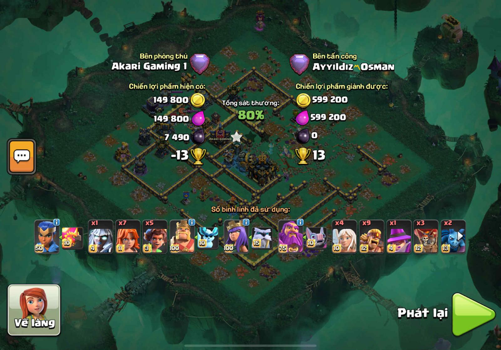 Lính thủ nhà mình sử dụng head hunter, super minion , witch , ice golem khiến cho đối thủ gặp khá nhiều rắc rối. 2 xbow hướng khu vực nhà chính mình để là phòng không và mặt đất, 2 cái còn lại mình để mặt đất.