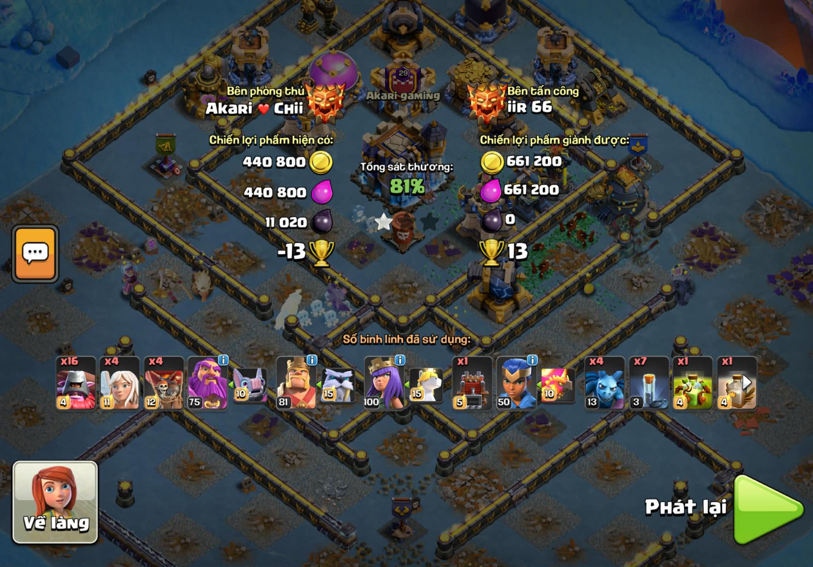 Lính thủ nhà mình sử dụng head hunter, super minion , witch , ice golem khiến cho đối thủ gặp khá nhiều rắc rối. 2 xbow hướng khu vực nhà chính mình để là phòng không và mặt đất, 2 cái còn lại mình để mặt đất.