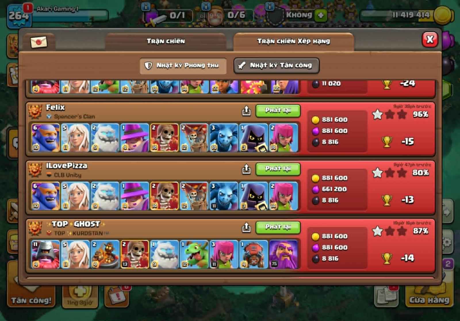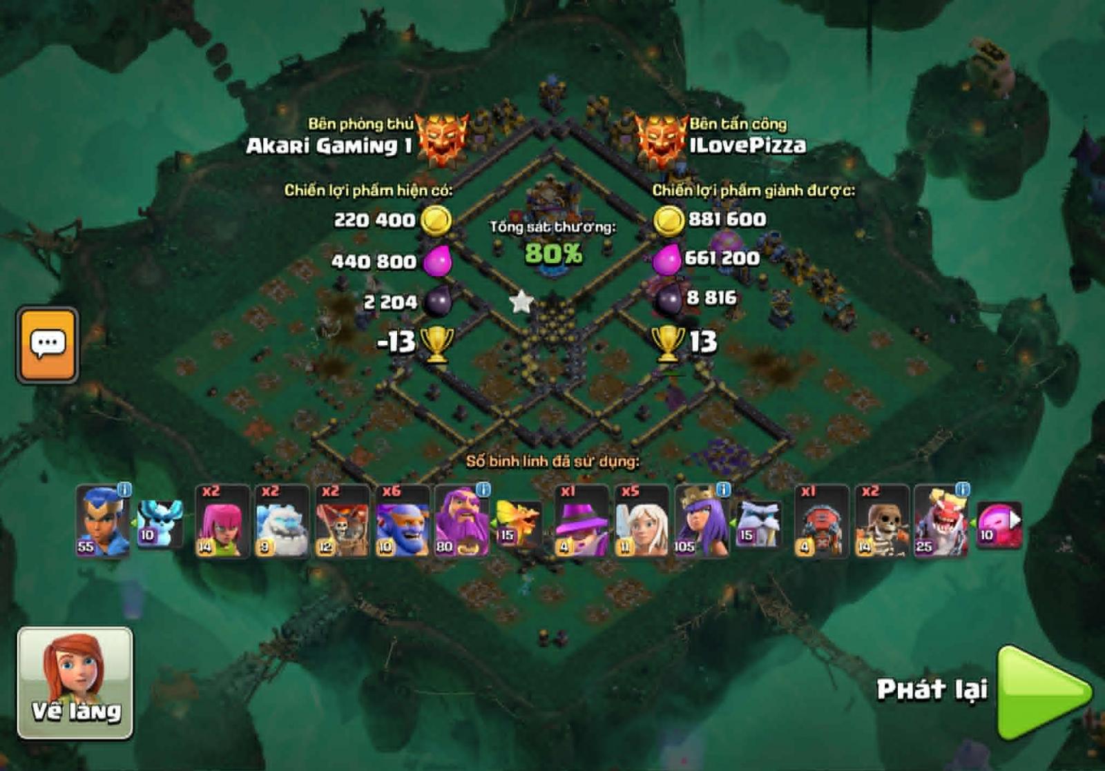 Lính thủ nhà mình sử dụng head hunter, super minion , witch , ice golem khiến cho đối thủ gặp khá nhiều rắc rối. 2 xbow hướng khu vực nhà chính mình để là phòng không và mặt đất, 2 cái còn lại mình để mặt đất.