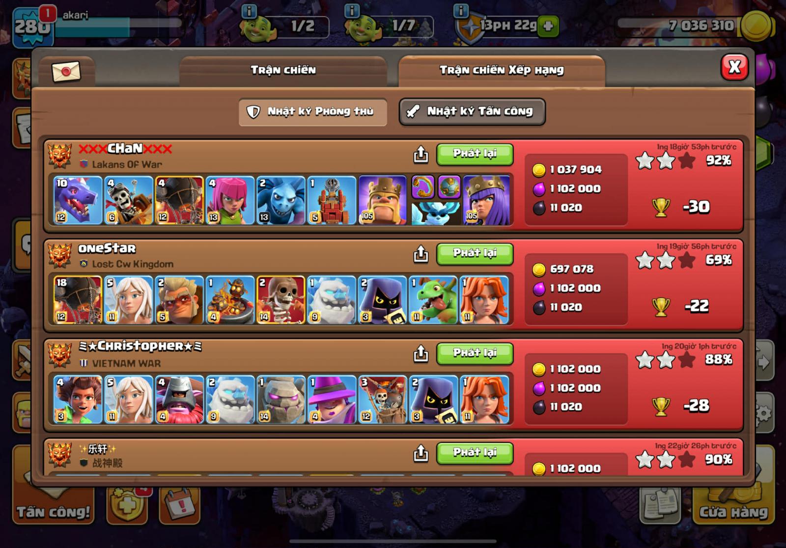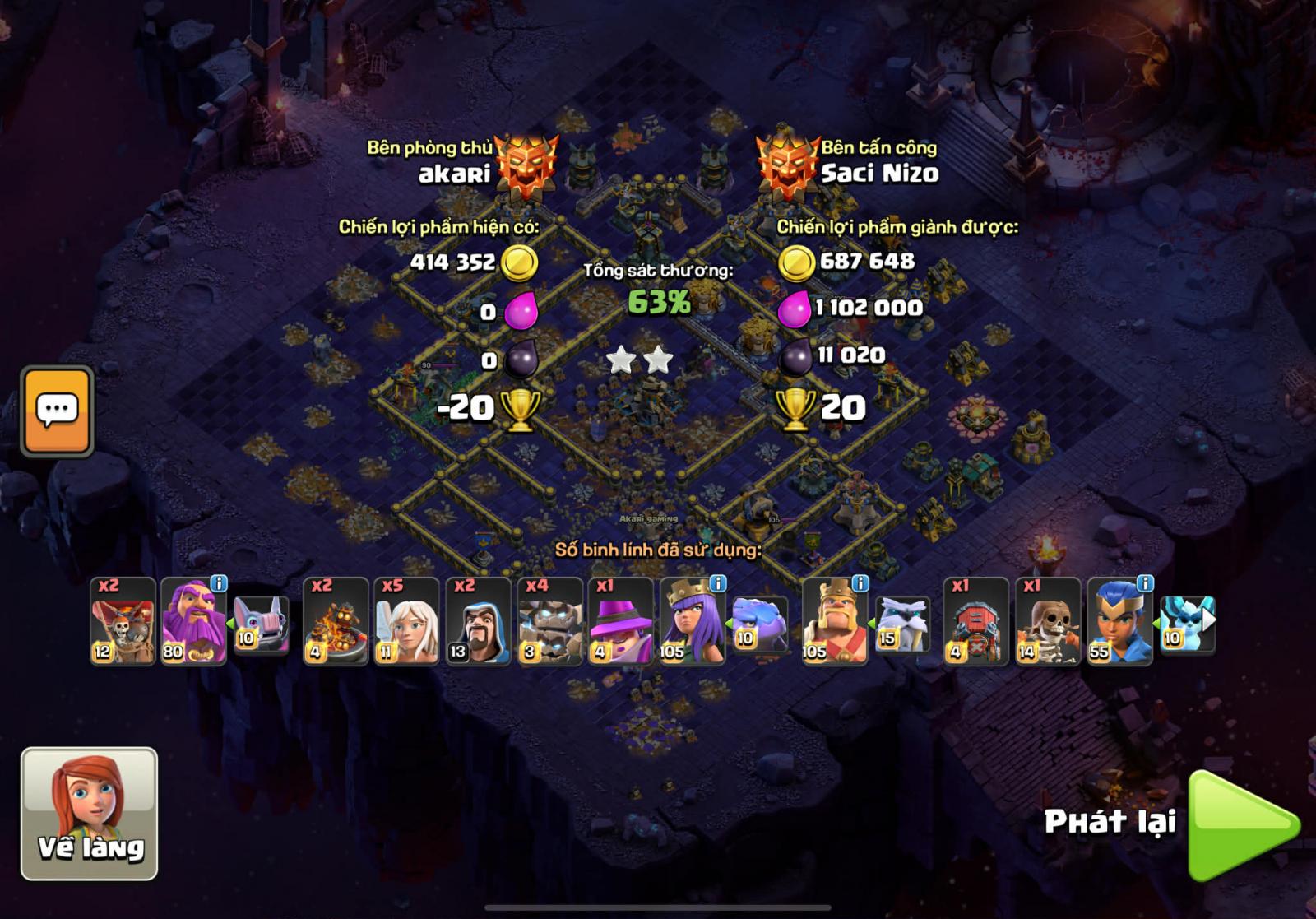 Lính thủ nhà mình sử dụng head hunter, super minion , witch , ice golem khiến cho đối thủ gặp khá nhiều rắc rối. 2 xbow hướng khu vực nhà chính mình để là phòng không và mặt đất, 2 cái còn lại mình để mặt đất.