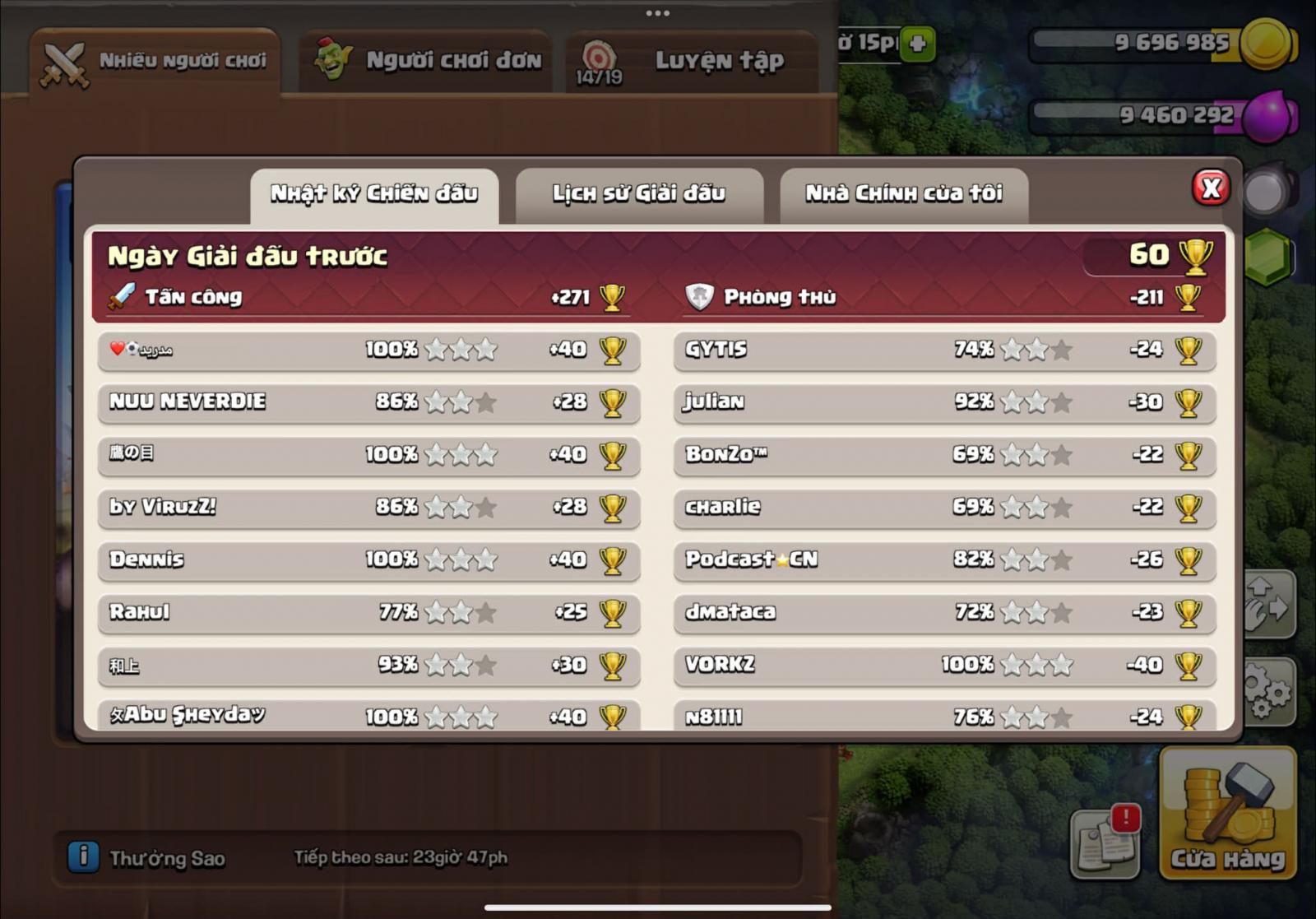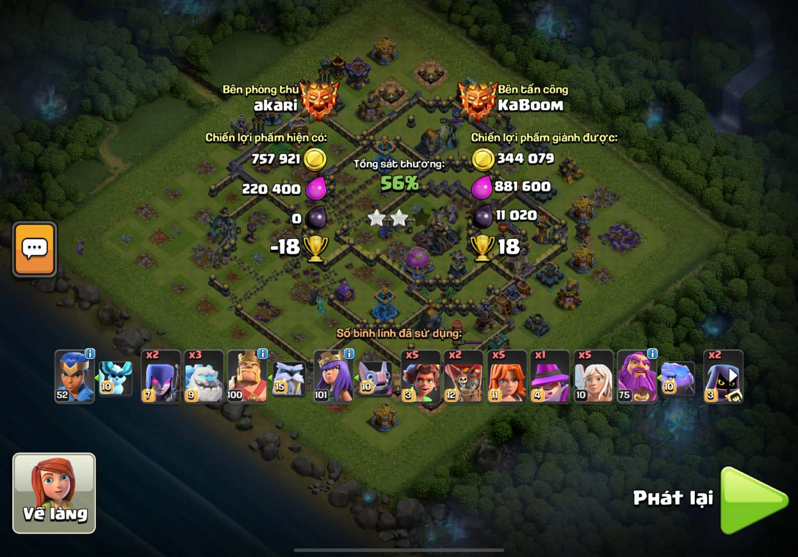 Lính thủ nhà mình sử dụng head hunter, super minion , witch , ice golem khiến cho đối thủ gặp khá nhiều rắc rối. 2 xbow hướng khu vực nhà chính mình để là phòng không và mặt đất, 2 cái còn lại mình để mặt đất.