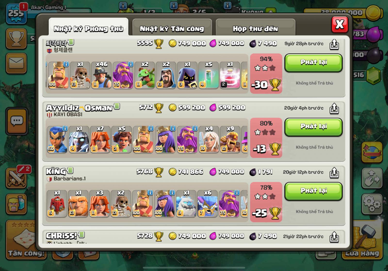 Lính thủ nhà mình sử dụng head hunter, super minion , witch , ice golem khiến cho đối thủ gặp khá nhiều rắc rối. 2 xbow hướng khu vực nhà chính mình để là phòng không và mặt đất, 2 cái còn lại mình để mặt đất.